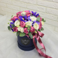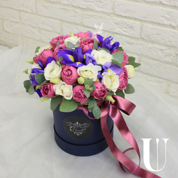 Композиция из синиих ирисов в фиолетовой шляпной коробке