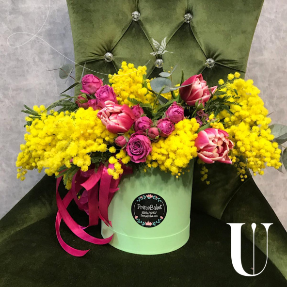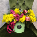 Композиция из белой кустовой хризантемы, кустовой розовой розы и желтых диантусов в шляпной коробке