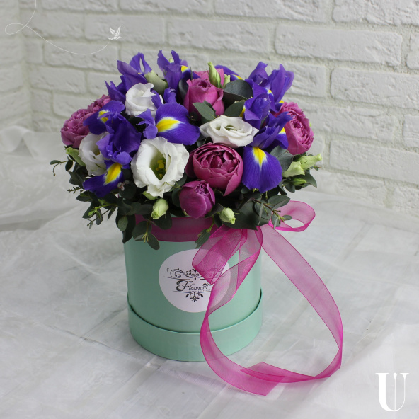 Композиция из синиих ирисов в фиолетовой шляпной коробке