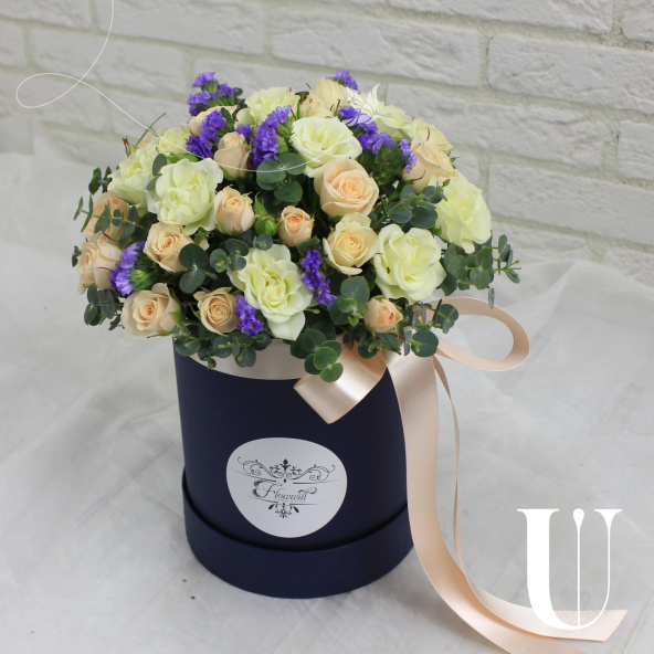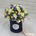 Диантус, кустовая роза, эустома и другие цветы в шляпной коробке