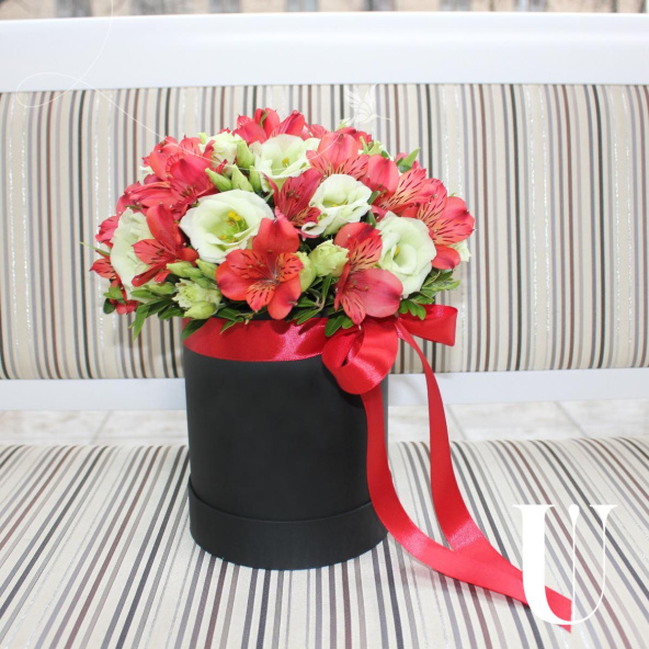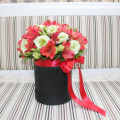 Композиция из роз, диантуса и лизиантуса в шляпной коробке