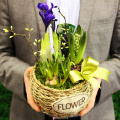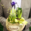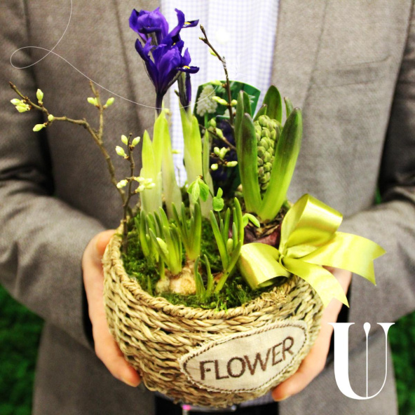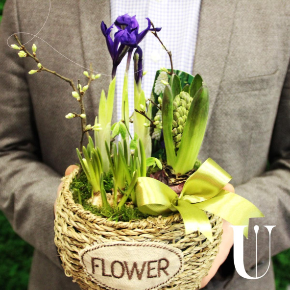 Плетеное кашпо 16*16*10 - 1шт, нарцис- 1шт, гиацинт - 2 шт, мох, бант, веточки.
