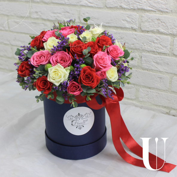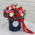 Диантус, кустовая роза, эустома и другие цветы в шляпной коробке