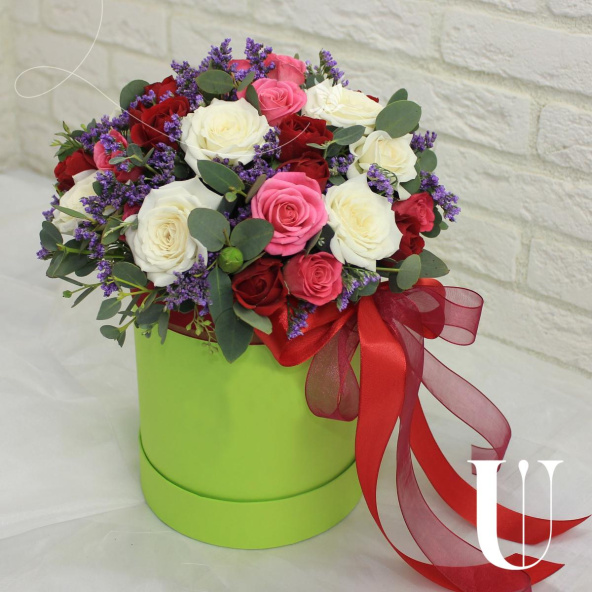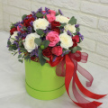 Композиция из роз, диантуса и лизиантуса в шляпной коробке