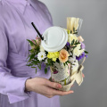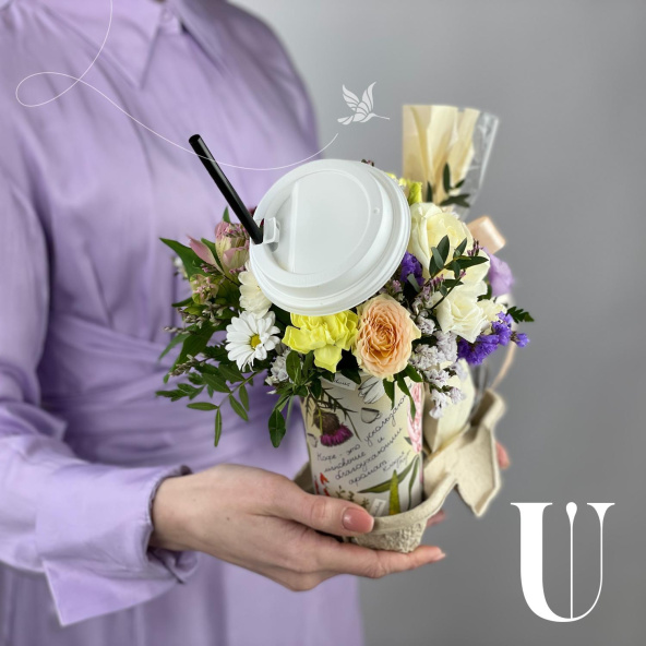 Стаканчик с цветами выполняется из сезонных цветов и композиция может немного отличаться от фото, но непременно будет яркой и красивой:)