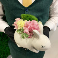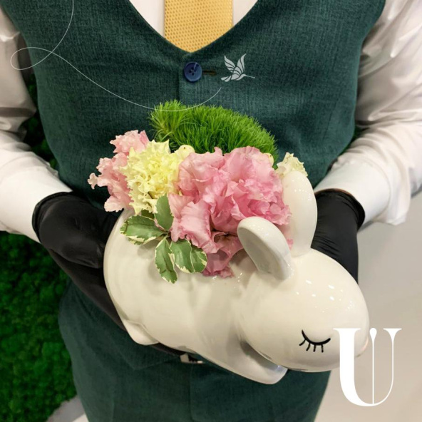 Кашпо керамическое люкс в форме зайца - 1 шт, эустома Алиса - 2 шт, гвоздика - 1шт, зелень.