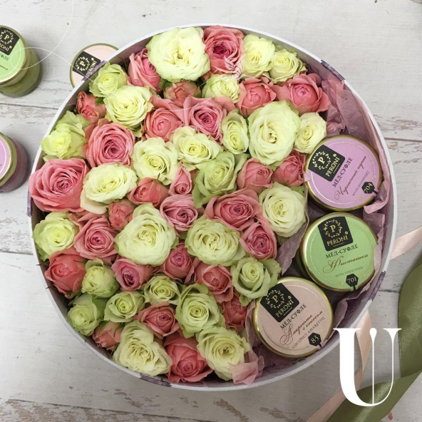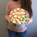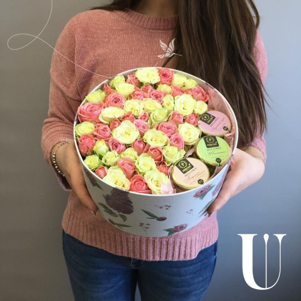 Нежная дизайнерская композиция из роз, гвоздик и гортензии в шляпной коробке