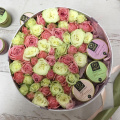 Композиция из гортензий микс и розовых диантусов в шляпной коробке