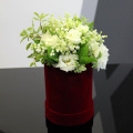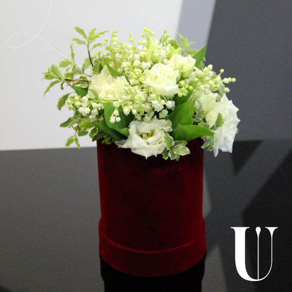 ландыш-40шт, эустома алиса-5шт, питтоспорум, шляпная коробка 15*15 см