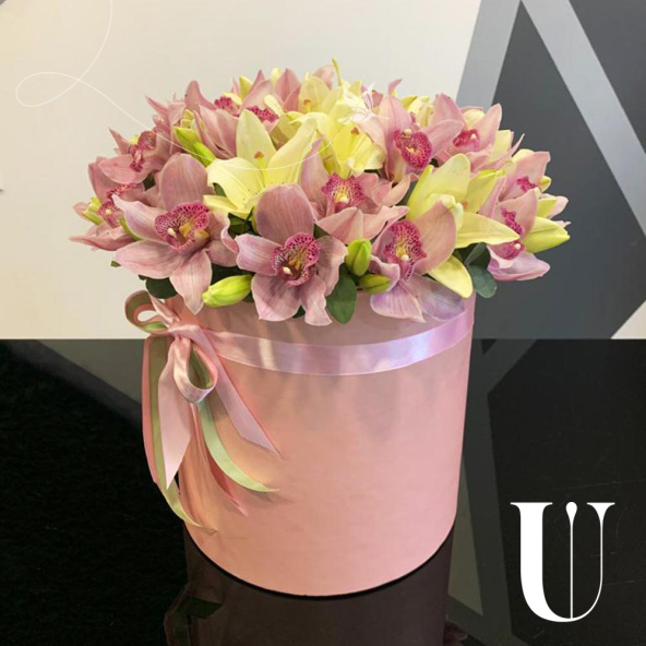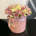 Композиция из белых орхидей и розовых роз в шляпной коробке