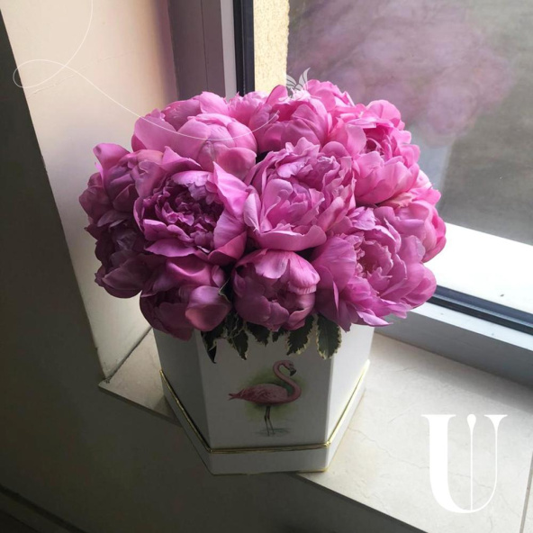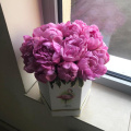 Композиция из малиновых кустовых пионовидных роз в шляпной коробке