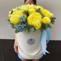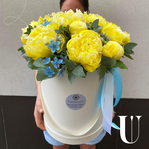 Желтый пион - 11, оксипеталум - 6, коробка шляпная - 1шт, эвкалипт