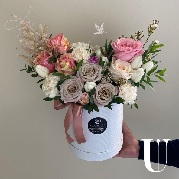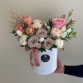 Композиция из диантусов, роз, лизиантусов и других цветов в белой шляпной коробке