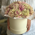Композиция из микса нежных гортензий в белой шляпной коробке