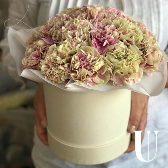 Цветочная композиция в шляпной коробке. В составе 19 шт. сортового диантуса