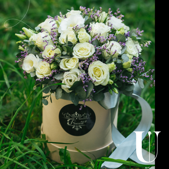 Гвоздики, розы, эустома и другие цветы в шляпной коробке