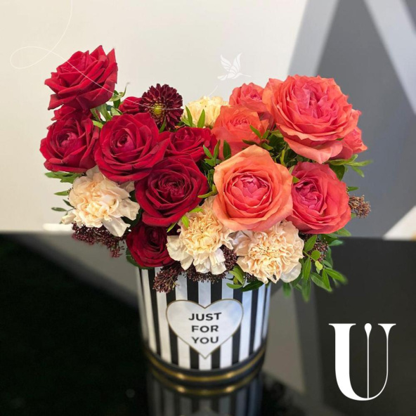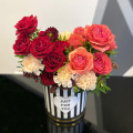 Роза -15шт., Диантус - 5шт., Скиммия - 5 шт., Коробка шляпная - 1 шт., зелень
