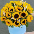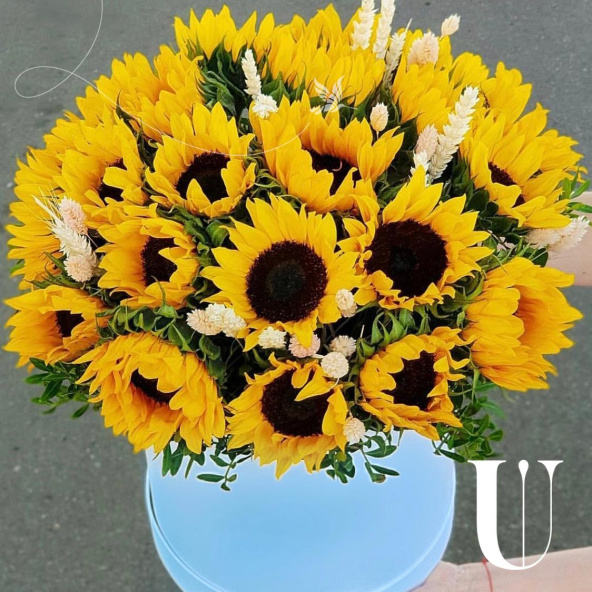 - 19 подсолнухов с колосками пшеницы в большой голубой шляпной коробке 20х25 см