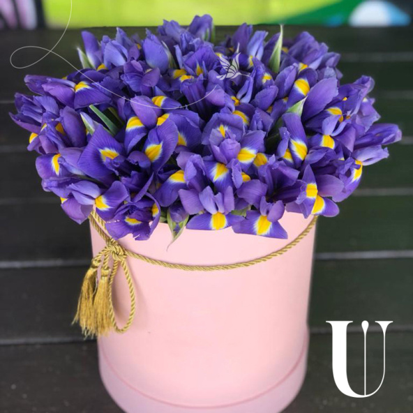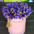 49 сиреневых ирисов в нежно розовой шляпной коробке