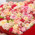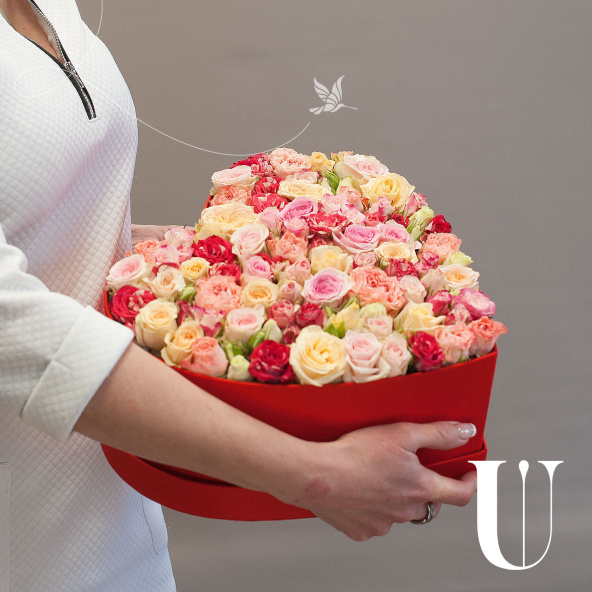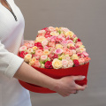 Композиция из диантусов, роз, лизиантусов и других цветов в белой шляпной коробке