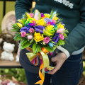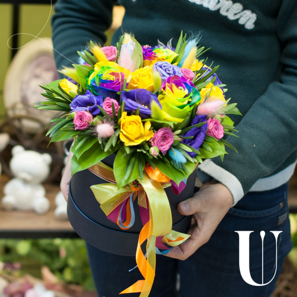 - Но очень изысканная шляпная коробка из радужных роз 3 шт