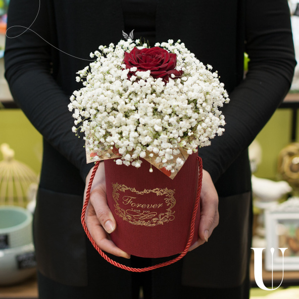 Розовая гортензия и белая гипсофила в розовой шляпной коробке