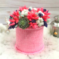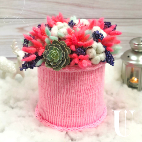 Хлопок, лагурус розовый, лагурус мятный, ягоды шинуса, эхеверия, вязаный чехол, коробка 18х20 см. Подарок, который будет радовать многие годы