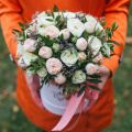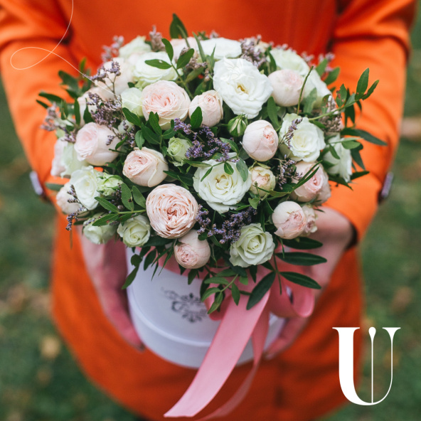 - Роза кустовая - 9 шт. эвкалипт - 1 шт. лента - 1 шт. цилиндр 14х17 - 1 шт. лимониум - 1 шт.Лента - 1 шт
