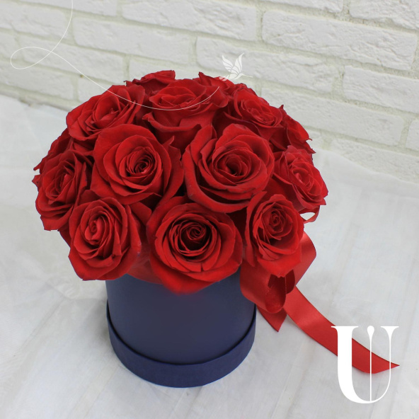 Композиция из роз Джумилия, белой гипсофилы и розовых альстромерий в голубой шляпной коробке