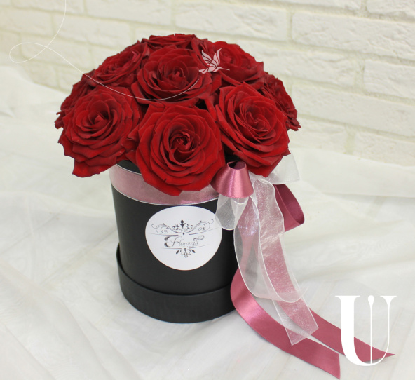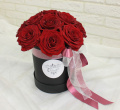 Композиция из роз, диантуса и лизиантуса в шляпной коробке