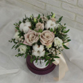 Композиция из микса нежных гортензий в белой шляпной коробке