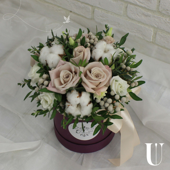 11 роз сорта сорта Эль Торро и белый лагурус в шляпной коробке