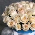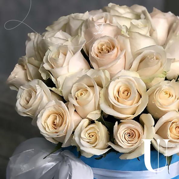 Композиция в белой гамме из диантусов, эустом и кустовых хризантем в шляпной коробке