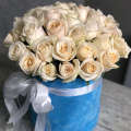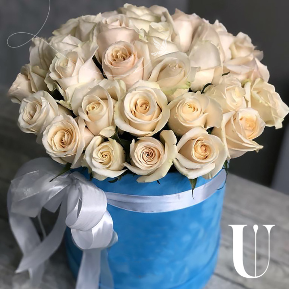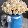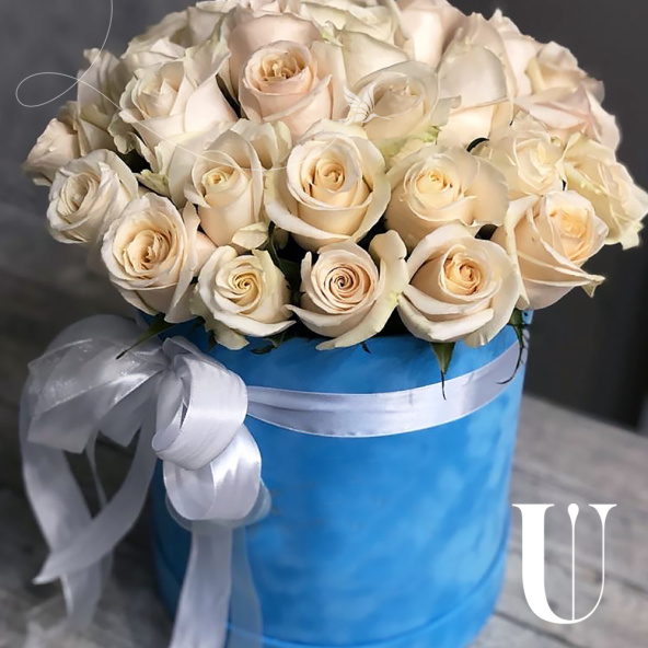 Красные розы Эксплорер в светло-голубой шляпной коробке
