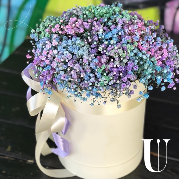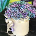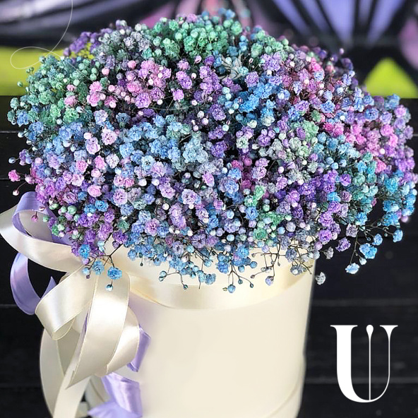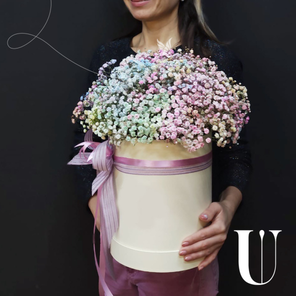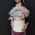 Композиция из белой гипсофилы и ночника в шляпной коробке