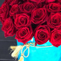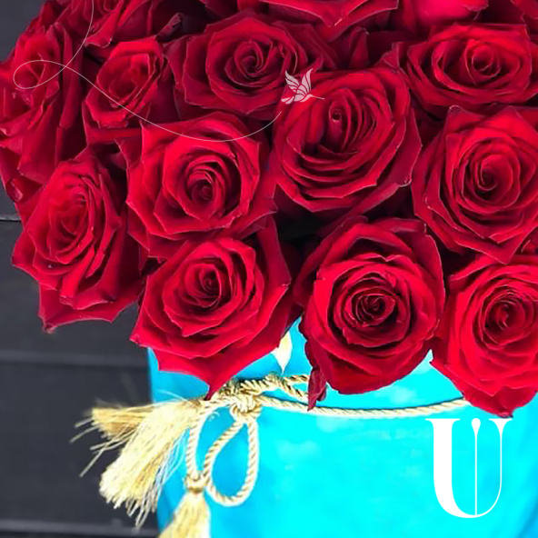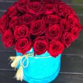 29 красных роз в бархатной шляпной коробке, перевязанной шнуром с кистями