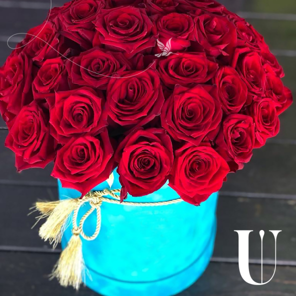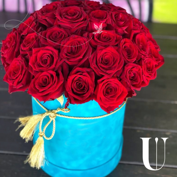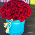 Красные розы Эксплорер в светло-голубой шляпной коробке