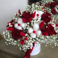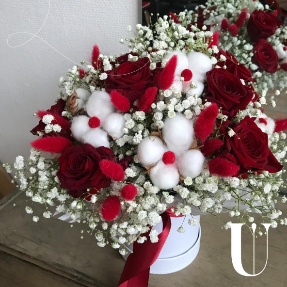 Шляпная коробка с розой ред наоми 9шт, гипсофилой 4шт, хлопком 5шт, дагурусом 8шт. Коробка 11*11