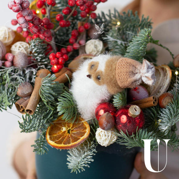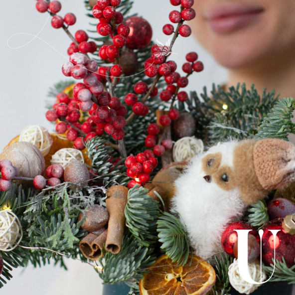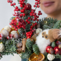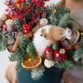 Композиция из малиновых кустовых пионовидных роз и мягкой игрушки в шляпной коробке