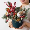 Композиция из роз, желтых орхидей, диантусов и других цветов в бордовой шляпной коробке