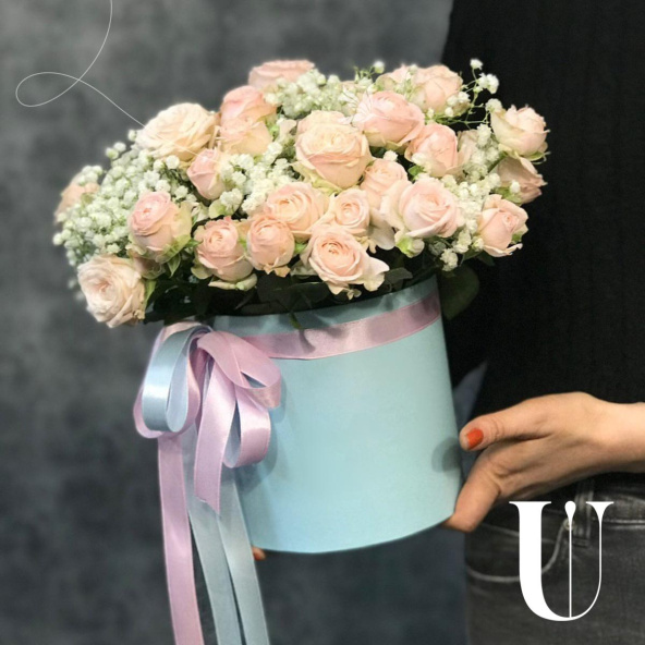 Нежная дизайнерская композиция из роз, гвоздик и гортензии в шляпной коробке