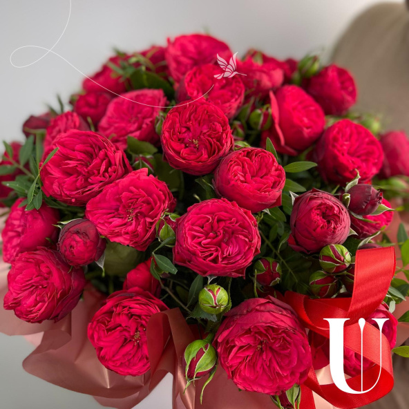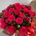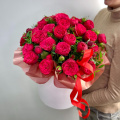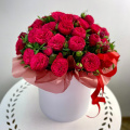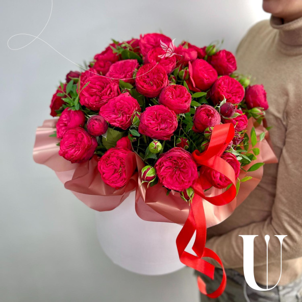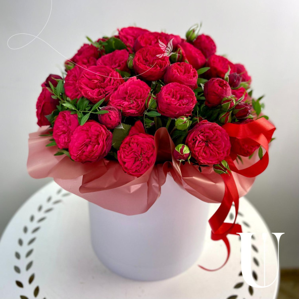 Композиция из малиновых кустовых пионовидных роз Мисти Бабблз в шляпной коробке