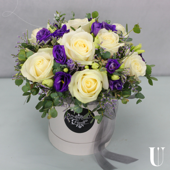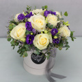 Композиция из диантусов, роз, лизиантусов и других цветов в белой шляпной коробке
