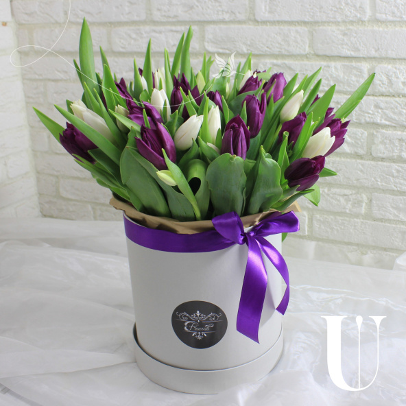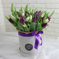 Композиция из маттиол, эустом, ранункулуса и других цветов в шляпной коробке