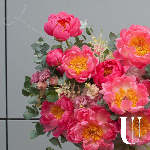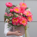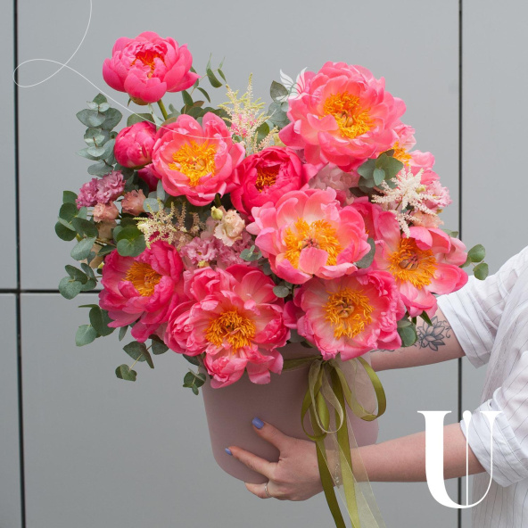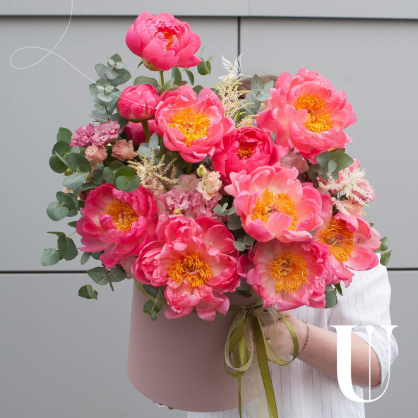 Представляем вашему вниманию композицию в коробке "Коралловые краски", состоящую из 15 коралловых пионов, 3 гортензий, 5 ветвей эвкалипта, 6 астильб, 5 лизиантусов.