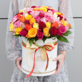 Коробка выполнена в форме шляпной коробки, что придает букету еще больше шарма и элегантности.