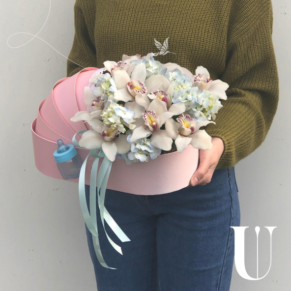 Нежная композиция из орхидей и альстромерий в шляпной коробке маджестик