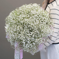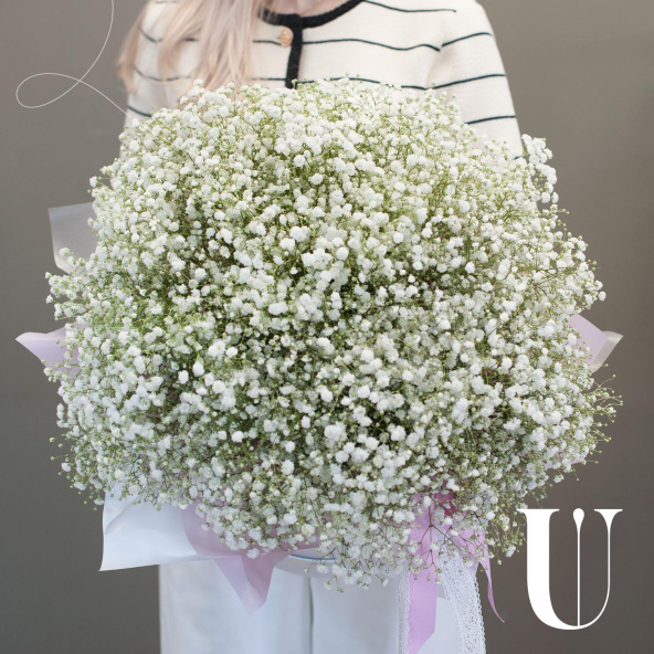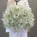 Цветы в композиции представлены в виде 25 белоснежных гипсофил, которые собраны на флористической губке. Это позволяет цветам сохранять свежесть и красоту на протяжении длительного времени.