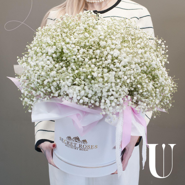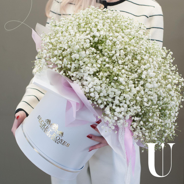 Шляпная коробка из белой гипсофилы "Воздушная" - это уникальное и стильное решение для подарка.