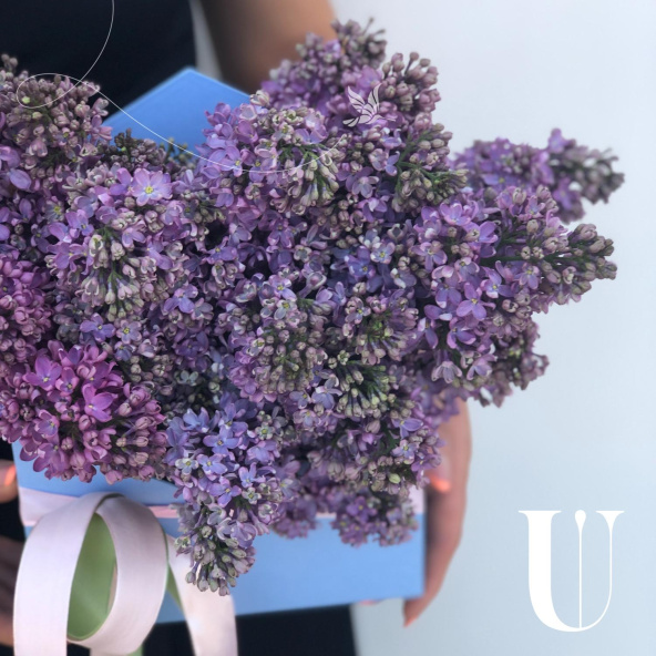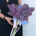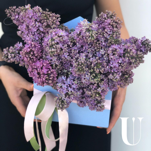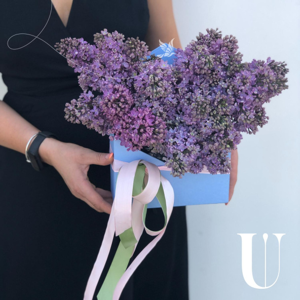 Композиция из синиих ирисов в фиолетовой шляпной коробке